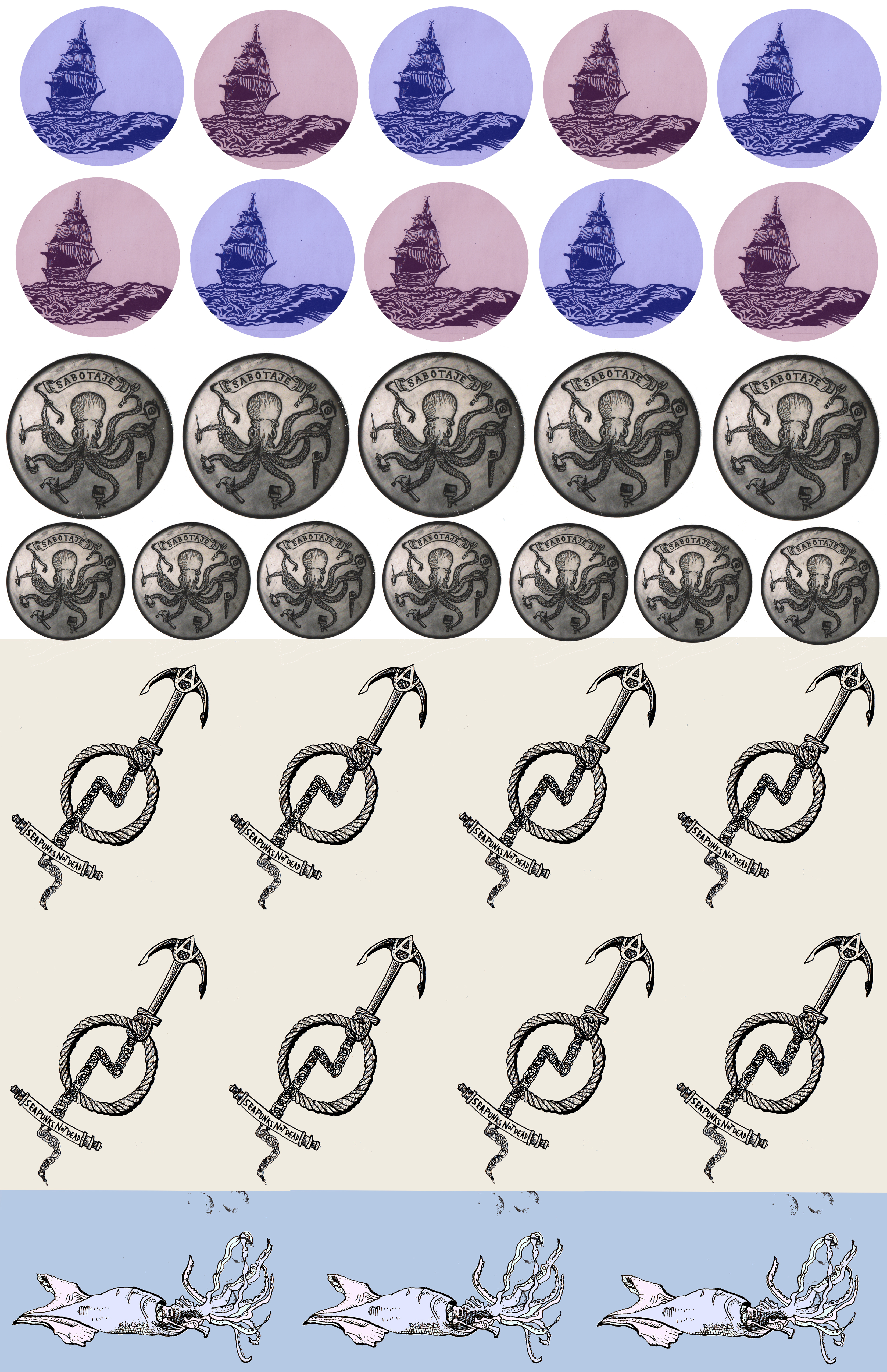 Octopus vs submarine, from a patch found at the “mercadillo punk” Barcelona, Spain. Later on I discovered that the drawing and the printing were made by Stefania, a friend of mine! She complained nobody was buying that patch, and she gave me the original drowing as a present!